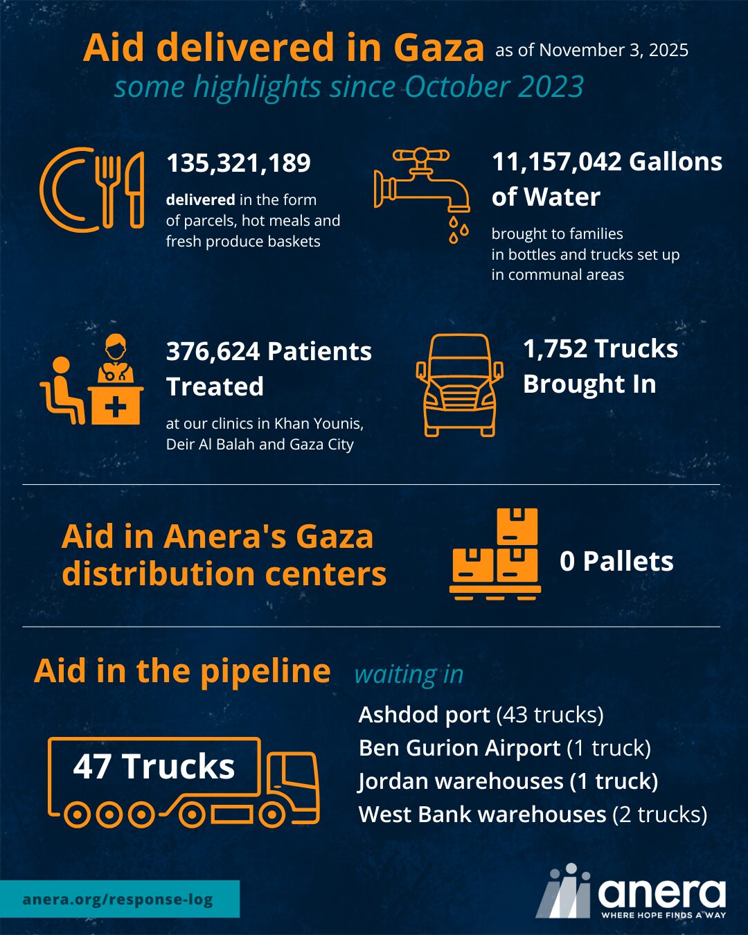 In this log, Anera provides updates on unfolding war in Palestine and our response. In some cases, additional activities may be added retroactively to the daily entries as we receive additional program reporting.