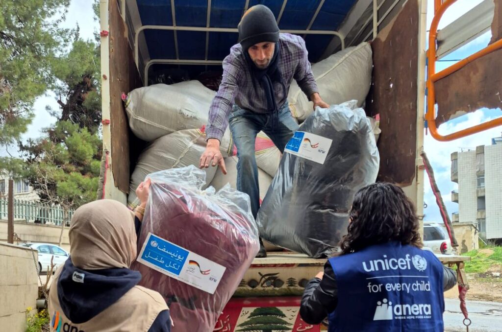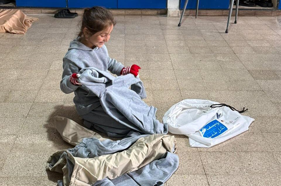 In the South today, we distributed hundreds of winter clothing kits and dozens of baby supplies to displaced families in the public shelters. Also in the South, young people in our vocational education programs are continuing to manufacture sleeping bags for the emergency response.