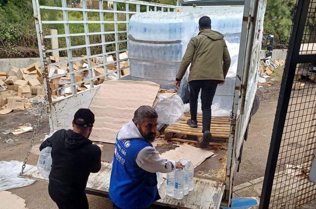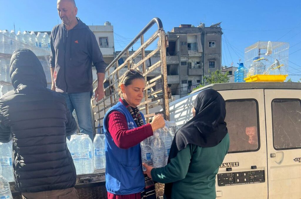 In partnership with Anera, UNICEF distributed 16,314 US gallons (61,752 liters) of bottled water to displaced families staying in collective shelters in Saida, South Lebanon. As thousands of people arrived in the city after fleeing their homes, access to safe drinking water became an urgent need inside overcrowded shelters.