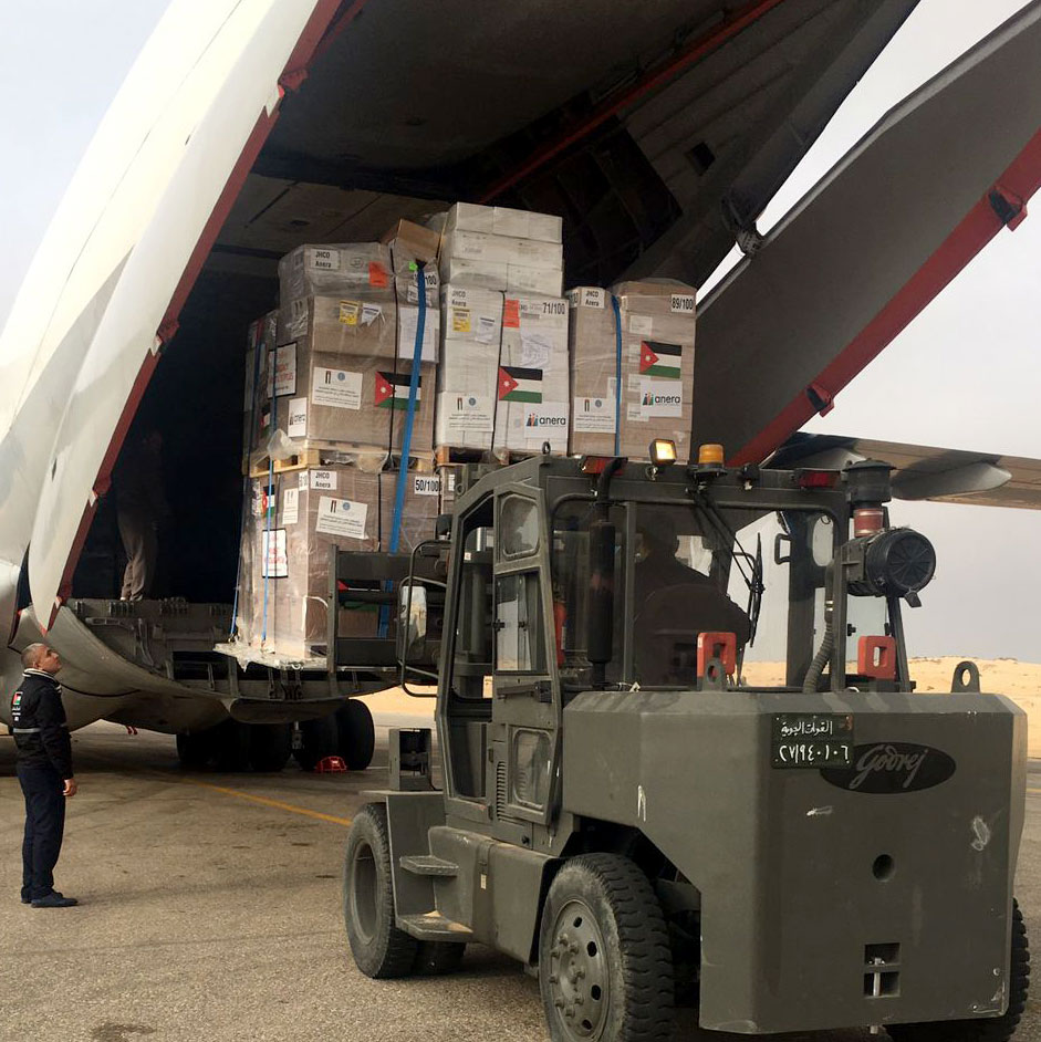 Today, a shipment of 100 pallets containing donated medicines and healthcare supplies arrived at El Arish airport in Egypt (pictures below). The shipment comes from Direct Relief and came through Jordan in coordination with the Jordan Hashemite Charity Organization. Another seven pallets, donated by International Health Partners, also arrived.