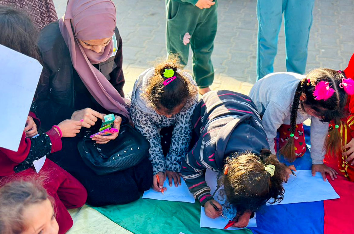We held psychosocial support activities at a UN school shelter in Khan Younis today, with 227 children participating. The activities included individual and group drawing sessions, a puppet show, competitive games, and music and dancing. Parents also joined in some of the games with their children. And we held two group sessions for mothers on how to support their children.