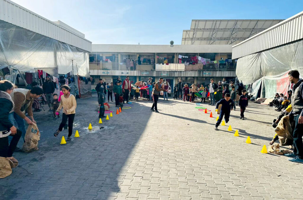 We held psychosocial support activities at two schools in Rafah today, with 400 children participating in competitive activities like races and games. The school shelters are becoming more crowded due to the arrival of so many displaced families from Khan Younis.