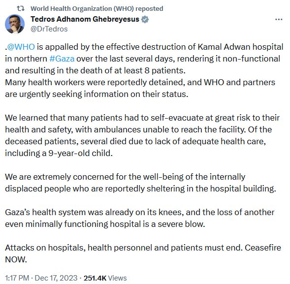 Last week Israeli forces raided Kamal Adwan Hospital in Gaza City and bulldozed the grounds, reducing the facility to rubble. OCHA reports that “According to initial reports by media and video footage, an Israeli military bulldozer flattened the tents of a number of internally displaced persons (IDPs) outside the hospital, killing and wounding an unconfirmed number of people.” Only 11 of Gaza’s 36 hospitals remain functional.