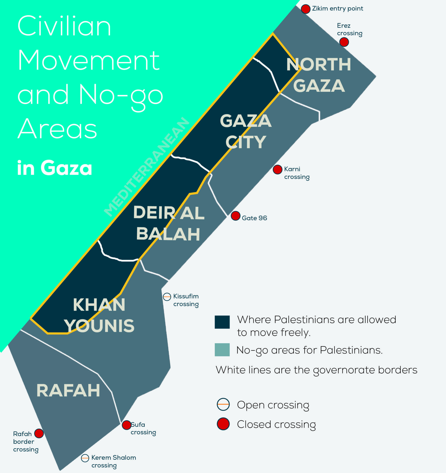 As Israel continues to invade the Gaza Strip, the land has become increasingly inaccessible to residents. While the territory itself has not shrunk, Israel now controls 50% of Gaza, pushing Palestinians onto less and less land. The growth of the military buffer zone along Gaza’s border, as well as the implementation of a new corridor across the south, significantly restricts Palestinian movement.